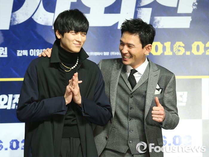 (서울=포커스뉴스) 4일 오후 서울 강남구 압구정 CGV에서 열린 영화 '검사외전' 제작보고회에 참석한 배우 강동원(왼쪽)과 황정민이 포토타임을 갖고 있다.
