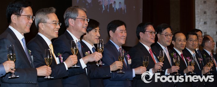 (서울=포커스뉴스) 5일 오후 서울 중구 롯데호텔에서 열린 '2016년 범금융 신년인사회'에서 최경환(오른쪽 여덟번째부터) 경제부총리 겸 기획재정부 장관, 이주열 한국은행 총재, 임종룡 금융위원장을 비롯한 참석자들이 기념촬영을 하고 있다.
