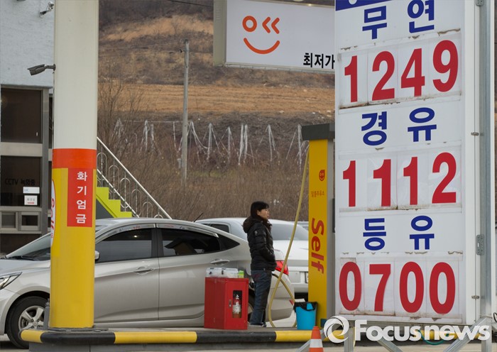 (음성=포커스뉴스) 국제유가 하락으로 휘발윳값이 7년 만에 최저가를 보인 가운데 6일 오전 11시 기준 충북 음성군 감곡면에 위치한 주유소에서 전국 최저가인 리터당 휘발유는 1249원, 경유는 1112원에 판매되고 있다.