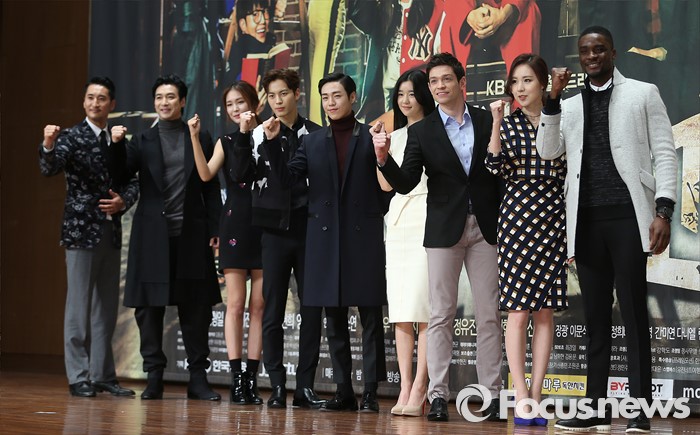 (서울=포커스뉴스) 6일 오후 서울 영등포구 63컨벤션센터에서 열린 KBS 2TV 월화드라마 '무림학교' 제작발표회에 참석한 배우 신현준(왼쪽부터), 신성우, 정유진, 이홍빈, 이현우, 서예지, 다니엘 린데만, 간미연, 샘 오취리가 포토타임을 갖고 있다.