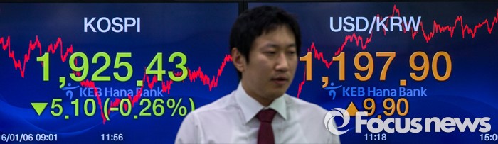 (서울=포커스뉴스) 코스피 지수가 전거래일 보다 5.10포인트(0.26%) 하락한 1,925.43에 거래를 마치며, 북한의 수소탄 실험에도 1920선을 지킨 6일 오후 서울 중구 KEB하나은행 본점 딜링룸에서 딜러들이 업무를 보고 있다. 이날 원달러 환율은 전거래일 보다 9.9원 오른 1197.9원에 마감하며, 지난해 9월 1200.9원 이후 4개월 만에 최고치를 기록 했다.