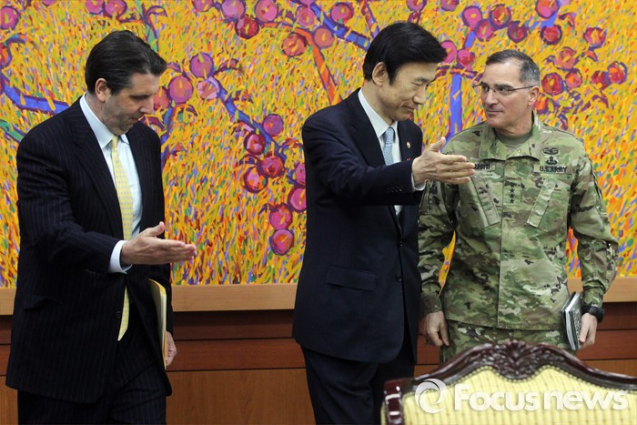 (서울=포커스뉴스) 북한이 첫 수소탄 핵실험을 실시했다고 발표한 6일 오후 서울 종로구 외교부청사에서 마크 리퍼트(왼쪽부터) 주한 미대사와 윤병세 외교부 장관, 커티스 스캐퍼로티 한미연합사령관이 기념촬영 후 자리로 향하고 있다.
