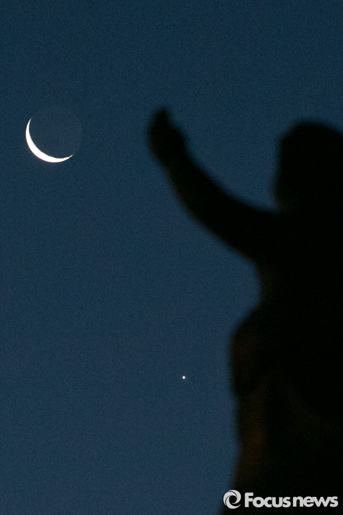 (서울=포커스뉴스) 7일 오전 서울 여의도 국회 평화와 번영의 상 하늘 위로 그믐달과 샛별이 밝게 빛나고 있다.