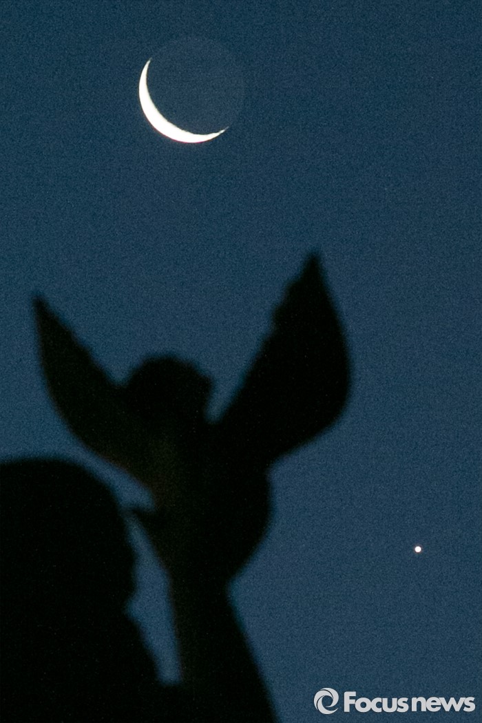 (서울=포커스뉴스) 7일 오전 서울 여의도 국회 평화와 번영의 상 하늘 위로 그믐달과 샛별이 밝게 빛나고 있다.