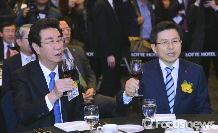(서울=포커스뉴스) 황교안 국무총리(오른쪽)와 최삼규 대한건설협회 회장이 7일 오후 서울 중구 롯데호텔에서 열린 건설인 신년인사회에서 건설인들과 건배를 하고 있다.