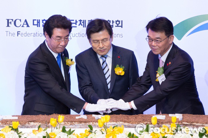(서울=포커스뉴스) 황교안 국무총리가 7일 오후 서울 중구 롯데호텔에서 열린 2016 건설인 신년인사회에 참석해 시루떡을 자르고 있다. 왼쪽부터 최삼규 대한건설단체총연합회장, 황교안 국무총리, 강호인 국토교통부 장관.