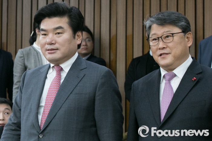 그는 한민구 국방부 장관이 전날(7일) 핵개발을 고려하고 있지 않다고 답변한 것에 대해 "정부의 이야기다. 우리 당은 다를 수가 있다"고 했다. 그러면서 "북핵 도발에 대한 단호한 대처는 기조가 다를 수 없다. 다만 방식에 대해 우리 당과 정부가 좀 다르게 표현할 수는 있는 것"이라고 했다.원유철(왼쪽) 새누리당 원내대표와 조원진 원내수석부대표가 8일 오전 서울 여의도 국회에서 열린 원내대책회의에 참석하고 있다. 2016.01.08 박철중 기자