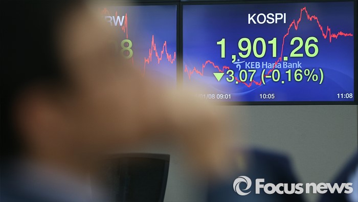 (서울=포커스뉴스) 남북 긴장고조와 중국발 악재 영향으로 코스피 지수 1889.42로 개장하고 1900선을 다시 회복한 8일 오전 서울 중구KEB하나은행 딜링룸에서 직원들이 업무에 열중하고 있다.