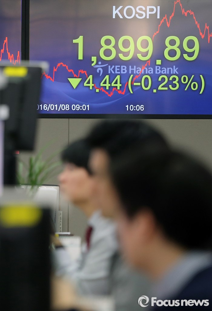 (서울=포커스뉴스) 남북 긴장고조와 중국발 악재 영향으로 코스피 지수 1900선이 무너진 8일 오전 서울 중구 KEB하나은행 딜링룸에서 직원들이 업무에 열중하고 있다.