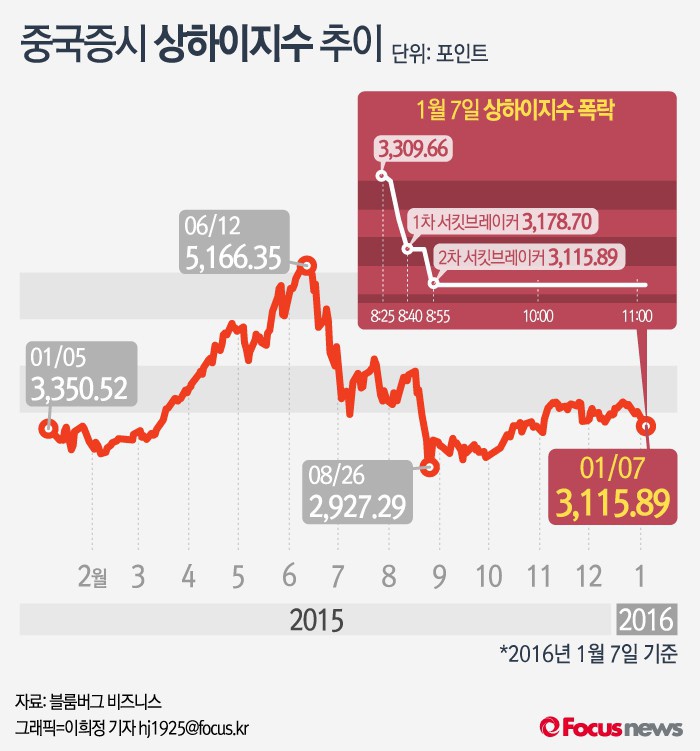 앞서 상하이지수는 4일과 7일 각각 7% 이상 하락, 거래가 중단됐다.(서울=포커스뉴스) 7일 상하이종합지수는 현지시각으로 10시5분 현재 전 거래일보다 7.32%(183.14포인트) 내린 3115.89에 거래가 완전 중단됐다. 이희정 기자