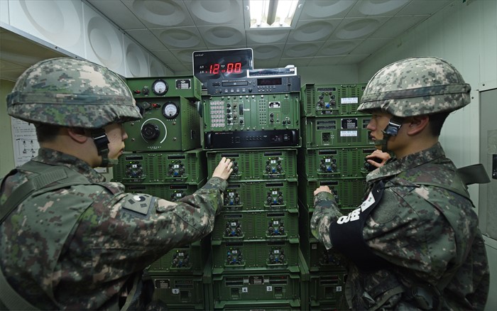 (서울=포커스뉴스) 북한의 수소폭탄 핵실험 도발에 대응하기 위해 정부가 '8.25 합의' 이후 중단했던 대북확성기 방송을 재개하기로 한 8일 오후 경기 중부전선 대북확성기 방송실에서 육군 장병들이 방송 기계를 작동시키고 있다. <사진제공=합동참모본부>