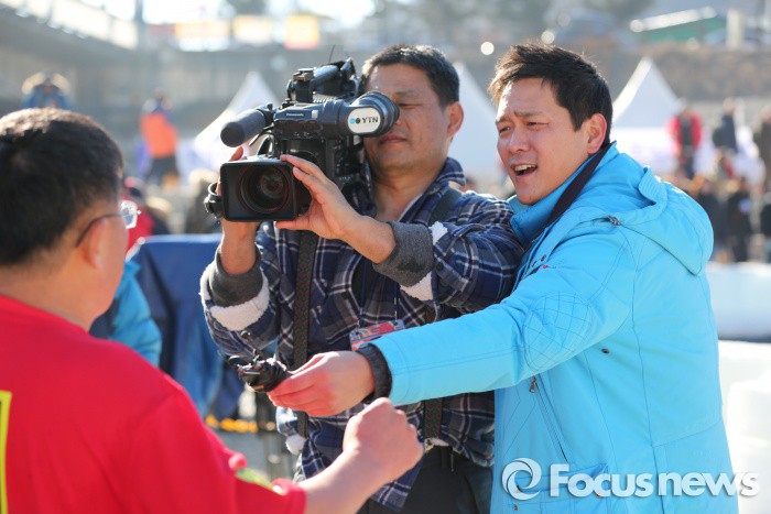 (화천=포커스뉴스) 9일 오전 강원도 화천군 화천읍 화천천 일원에서‘2016 얼음나라 화천 산천어축제’가 개막한 가운데 산천어맨손잡기 체험을 하는 현장의 YTN 취재진의 열기가 뜨겁게 달아오르고 있다.