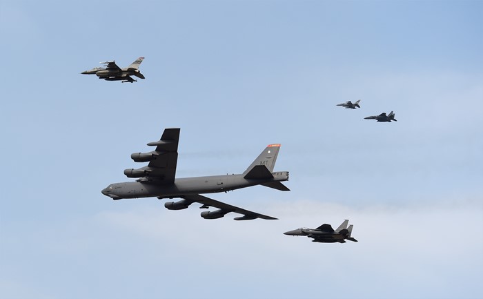 (서울=포커스뉴스) 북한의 수소폭탄 실험 이후 미국의 핵우산 제공 방침에 따라 미 공군의 전략 폭격기가 한반도로 전개한 10일 경기도 평택시 주한미군 오산공군기지 상공에 B-52 폭격기와 우리 공군의 F-15K와 미군 F-16 전투기의 호위를 받으며 비행하고 있다. <사진제공=국방일보>