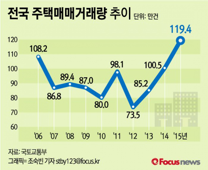 (서울=포커스뉴스) 11일 국토교통부는 2015년 연간 주택매매거래량은 119만3691건으로 전년대비 18.8% 증가하며 2006년 통계집계 이후 최대치를 기록했다고 밝혔다.