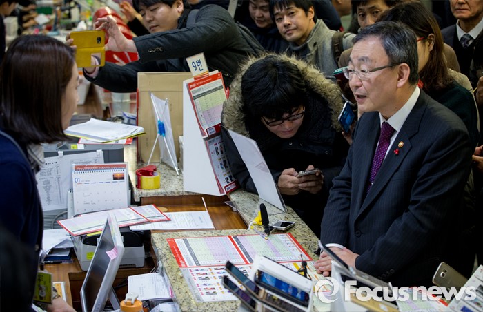 (서울=포커스뉴스) 13일 오후 서울 중구 중앙우체국 알뜰폰 판매창구를 찾은 최성준 방송통신위원장이 직원과 대화하고 있다.