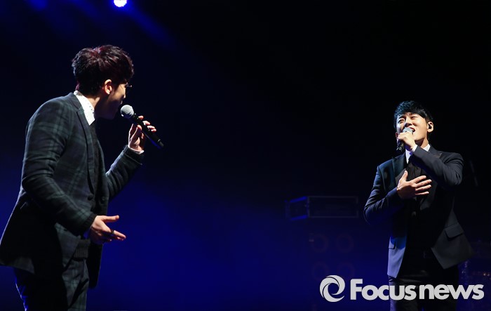 (서울=포커스뉴스) 13일 오후 서울 강남구 일지아트홀에서 열린 남성 3인조 그룹 V.O.S의 미니앨범 'Re:Union, The Real' 쇼케이스에 참석한 멤버 최현준(왼쪽)과 박지헌이 신곡 '그 사람이 너니까'의 무대를 선보이고 있다.
