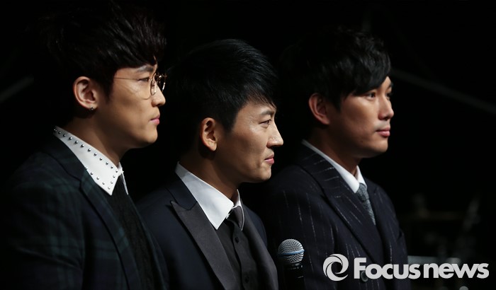 (서울=포커스뉴스) 13일 오후 서울 강남구 일지아트홀에서 열린 남성 3인조 그룹 V.O.S의 미니앨범 'Re:Union, The Real' 쇼케이스에 참석한 멤버 최현준(왼쪽부터), 박지헌, 김경록이 취재진을 바라보고 있다.