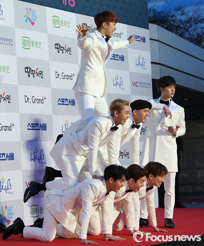 (서울=포커스뉴스) 14일 오후 서울 송파구 올림픽 체조경기장에서 열린 '25회 하이원 서울가요대상' 시상식에 참석한 아이돌그룹 비투비의 멤버들이 포토타임을 갖고 있다.