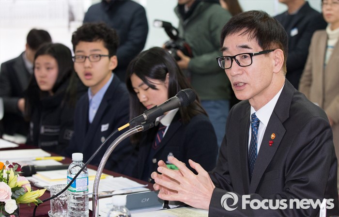 (세종=포커스뉴스) 이준식 사회부총리 겸 교육부장관이 15일 오전 세종시 조치원여자중학교에서 열린 자유학기제 현장간담회에 참석해 인사말을 하고 있다.