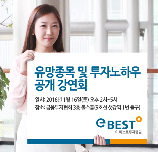 (서울=포커스뉴스) 이베스트투자증권이 오는 16일 '2016년 1~2월 유망종목 및 투자노하우 공개 강연회'를 개최한다.