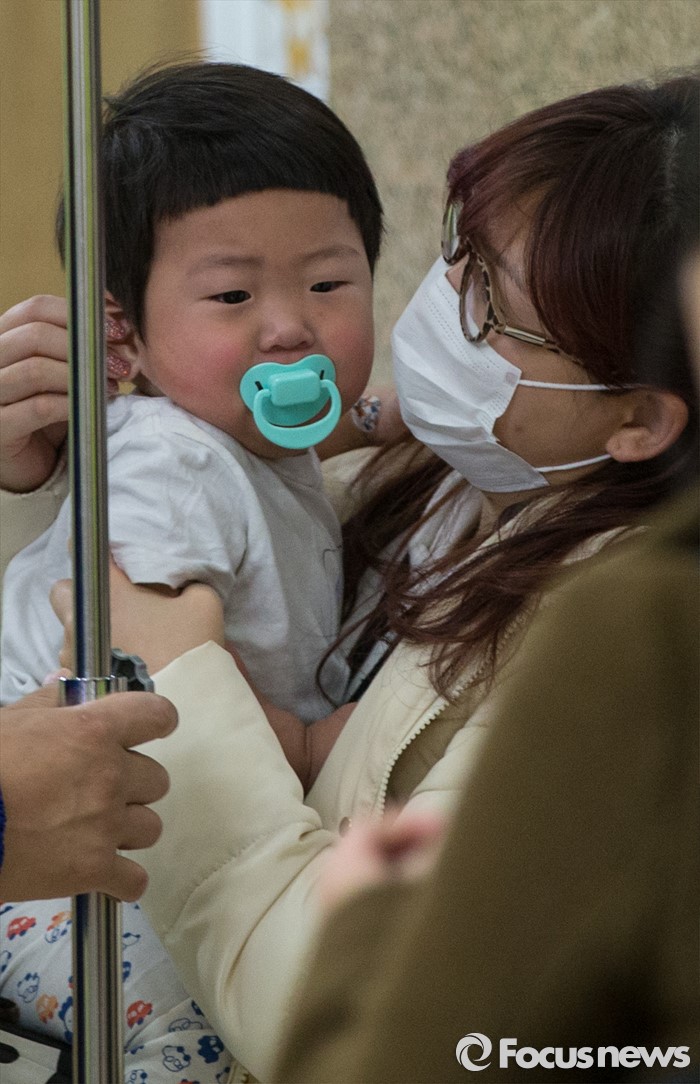 (서울=포커스뉴스) 인플루엔자 유행주의보가 발령된 15일 오전 서울 용산구 소화아동병원에서 한 엄마가 우는 자녀를 달래고 있다.
