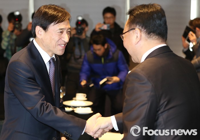 (서울=포커스뉴스) 15일 오후 서울 중구 은행회관에서 유일호(오른쪽) 경제부총리와 이주열 한국은행 총재가 오찬 회동에 앞서 악수를 하고 있다.