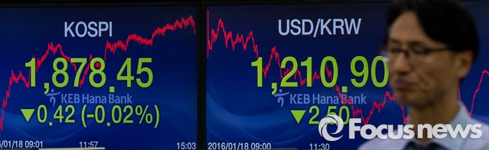 (서울=포커스뉴스) 코스피 지수가 중국 경제에 대한 불안감과 국제유가 하락 등의 여파로 전 거래일 대비 0.42포인트(0.02%) 하락한 1878.45로 마감한 18일 오후 서울 중구 KEB하나은행 딜링룸에서 딜러들이 업무를 보고 있다. 이날 원달러 환율은 전 거래일보다 1.5원 하락한 1,210.9원, 원위안 환율은 전거래일보다 0.63원 오른 183.93원에 장을 마쳤다.