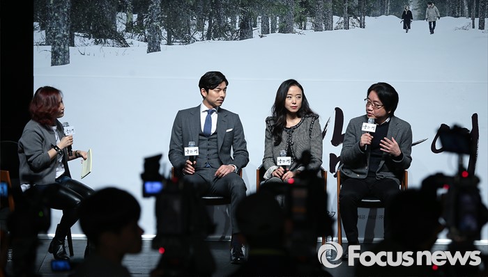 (서울=포커스뉴스) 19일 오전 서울 강남구 압구정 CGV에서 열린 영화 '남과 여' 제작보고회에 참석한 영화감독 이윤기가 촬영 소감을 밝히고 있다. 왼쪽부터 방송인 박경림, 배우 공유, 전도연, 영화감독 이윤기.