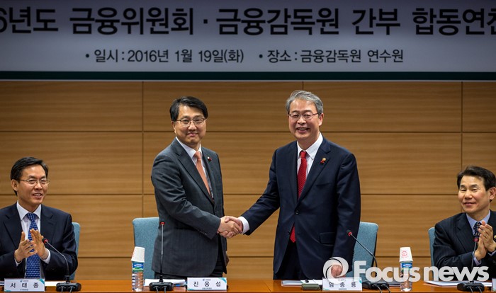 (서울=포커스뉴스) 임종룡 금융위원회 위원장과 진웅섭 금융감독원장이 19일 오후 서울 종로구 금융감독원 연수원에서 열린 '금융위원회-금융감독원 간부 합동연찬회'에 자리해 악수 하고 있다.