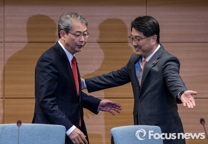 (서울=포커스뉴스) 임종룡(왼쪽) 금융위원회 위원장과 진웅섭 금융감독원장이 19일 오후 서울 종로구 금융감독원 연수원에서 열린 '금융위원회-금융감독원 간부 합동연찬회'에 자리하기 위해 연찬회장으로 들어서고 있다.