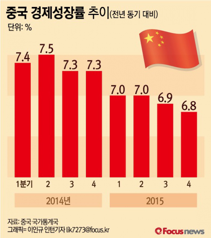 (서울=포커스뉴스) 19일 중국통계국은 2015년 4분기 경제성장률(GDP)이 전년 동기 대비 6.8%라고 밝혔다.
