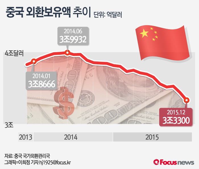 (서울=포커스뉴스) 19일 금융투자업계와 금융당국 등에 따르면 중국의 외환보유액은 2015년말 기준 외환보유액은 3조3330억달러로 2014년 6월 3조9932억달러로 정점을 찍은 이후 1년6개월 만에 6629억달러 줄었다.