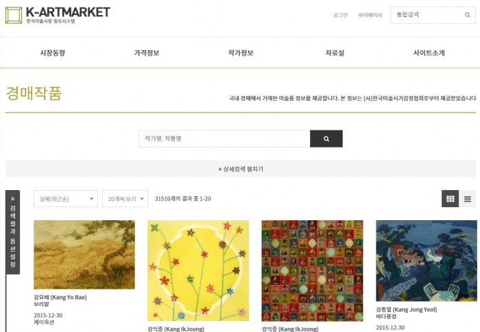 예경과 시감은 올 연말까지 1998년부터 거래된 경매정보 약 10만 건을 시스템에 등록하고 각종 연구·분석 자료와 국공립 레지던스 작가정보 등을 주기적으로 공개해 나갈 예정이다.한국 미술시장 정보시스템(www.k-artmarket.kr) 홈페이지 화면 캡처.<사진출처=한국 미술시장 정보시스템>