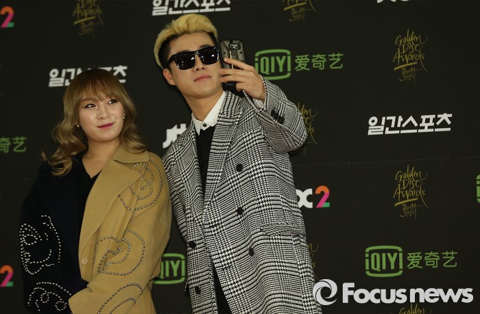 (서울=포커스뉴스) 20일 서울 동대문구 경희대학교 평화의 전당에서 열린 제 30회 골든디스크 시상식에 참석한 가수 강민희와 래퍼 산이가 포토타임을 갖고 있다.