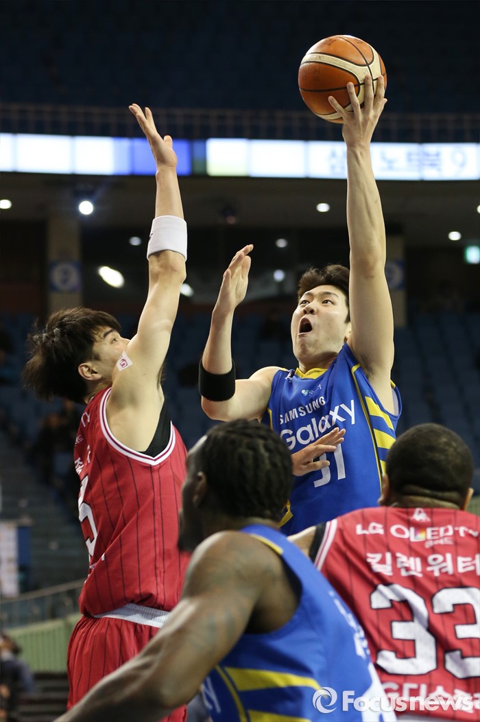 (서울=포커스뉴스) 20일 서울 잠실실내체육관에서 열린 2015-2016 프로농구 삼성-LG 경기에서 삼성 김준일이 LG 김종규의 마크를 받으며 점프슛을 쏘고 있다.