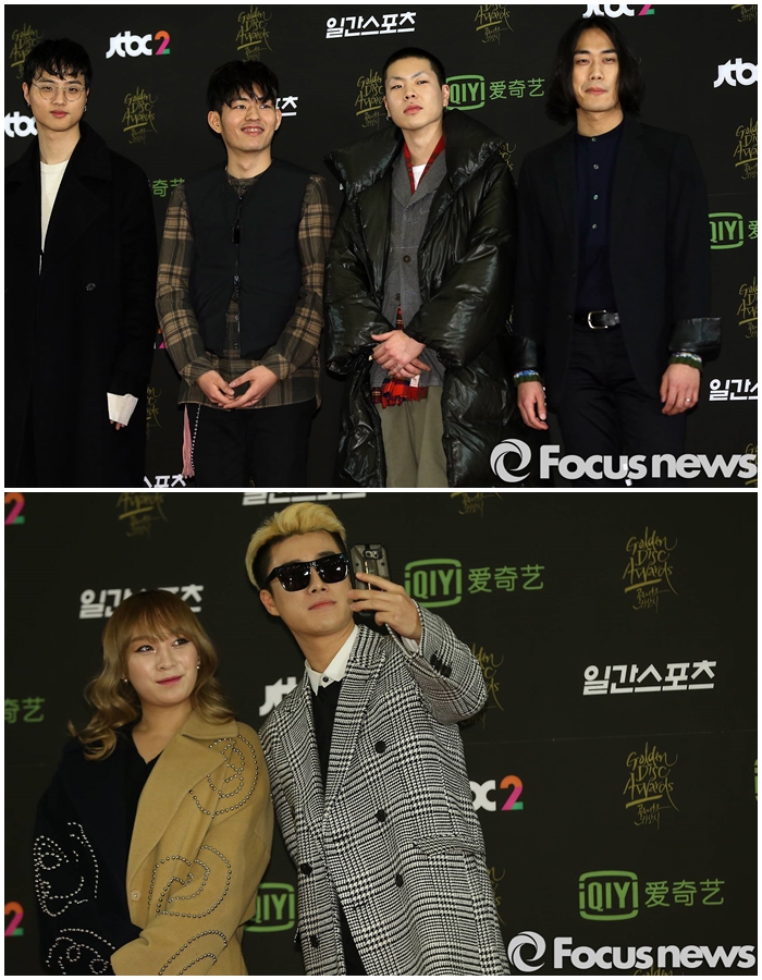 ‘골든디스크’는 음원과 음반 판매량을 기준으로 지난 한해(2014년 11월~2015년 11월 집계 기간) 동안 가장 사랑 받은 대중음악과 가수를 선정하는 시상식이다. 20일과 21일 양일에 걸쳐 디지털 음원 대상과 음반 대상으로 나뉘어 시상한다.(서울=포커스뉴스) 20일 서울 동대문구 경희대학교 평화의 전당에서 열린 제 30회 골든디스크 시상식에 참석한 밴드 혁오(위)와 래퍼 산이가 포토타임을 갖고 있다. 2016.01.20 김유근 기자