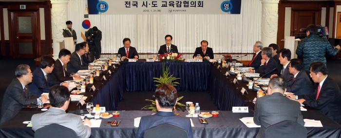 (부산=포커스뉴스) 이준식 교육부 장관이 21일 오후 부산 해운대 그랜드호텔에서 열린 전국 시·도교육감협의회 총회에 참석해 질문을 받고 있다. 이날 총회는 누리과정 예산 및 총회 상정 안건, 사무국 제안 안건 등을 논의했다. <사진제공=교육부>