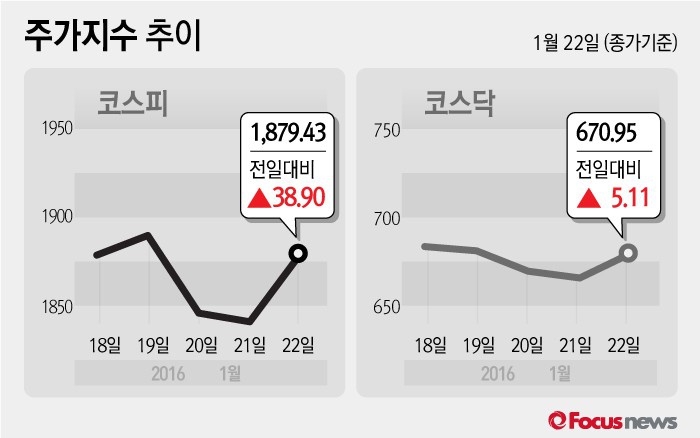 (서울=포커스뉴스) 22일 코스피지수는 전날 보다 2.11%(38.90포인트) 오른 1879.43에 장을 마쳤다. 코스닥지수는 전일 대비 0.77%(5.11포인트) 오른 670.95에 마감했다.