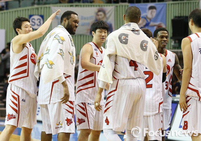 (서울=포커스뉴스) 24일 서울 잠실실내체육관에서 열린 2015-2016 프로농구 삼성-오리온 경기에서 삼성을 물리치면서 공동 선두로 올라선 오리온 선수들이 경기를 마치고 하이파이브를 하면서 기뻐하고 있다.