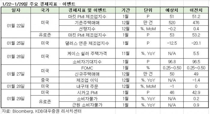 오는 22일(현지시간)에는 미국 1월 마킷 PMI제조업지수가 발표된다. 시장 평균 추정치는 51.0P로 전월 51.2P 대비 소폭 둔화될 것으로 예상된다.