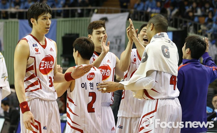 (서울=포커스뉴스) 24일 서울 잠실실내체육관에서 열린 2015-2016 프로농구 삼성-오리온 경기에서 삼성을 물리치면서 공동 선두로 올라선 오리온 선수들이 경기를 마치고 하이파이브를 하면서 기뻐하고 있다.
