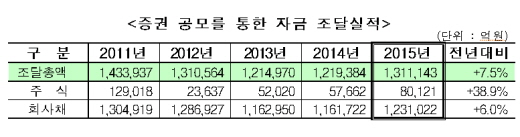 이는 2014년(121조9384억원) 대비 7.5% 늘어난 수치다. 금감원은 주식을 통한 자금조달과 회사채 발행이 모두 늘어나면서 직접금융 규모가 커지게 됐다고 설명했다.