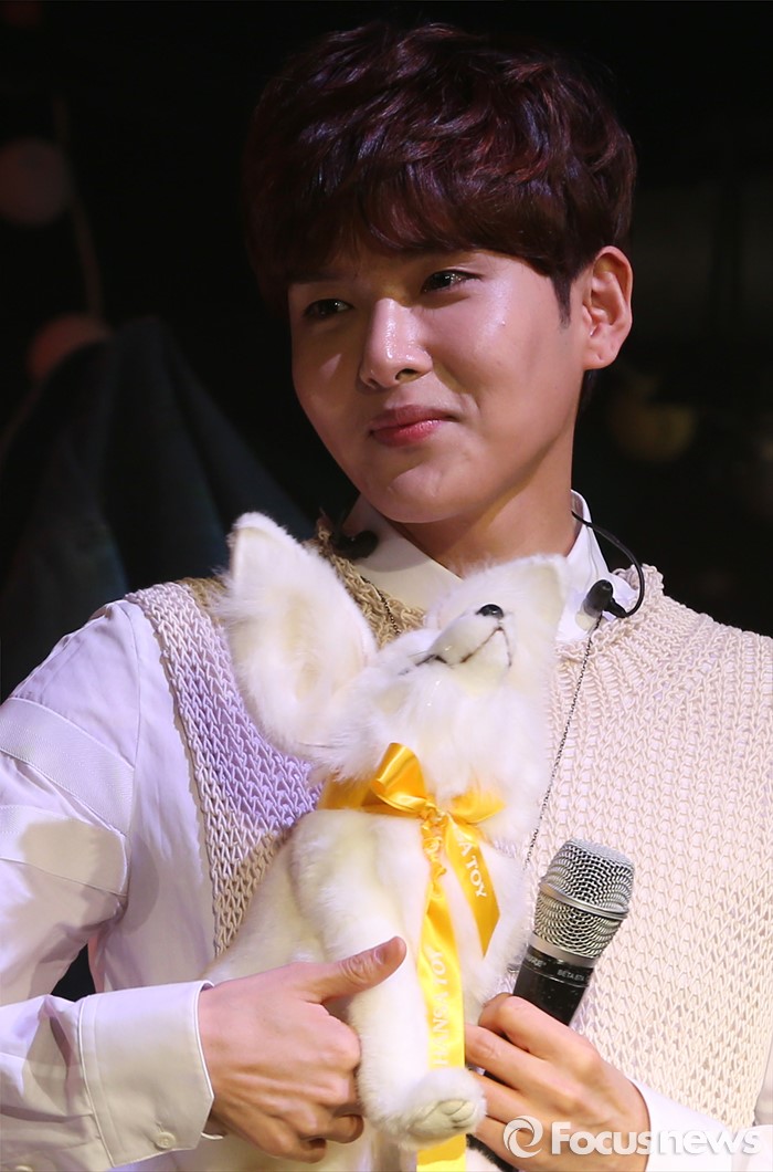(서울=포커스뉴스) 25일 오후 서울 용산구 현대카드 언더스테이지에서 열린 미니앨범 '어린왕자' 쇼케이스에 참석한 가수 려욱이 사막여우 인형을 들고 미소를 짓고 있다.