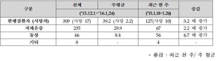 전국 530개 응급실 운영 의료기관이 참여하는 ‘한파로 인한 한랭질환 감시체계’ 운영결과에 따르면 운영기간 동안(12월1일~1월24일) 한랭질환자는 총 309명이었고 그 중 사망자는 17명이었다.