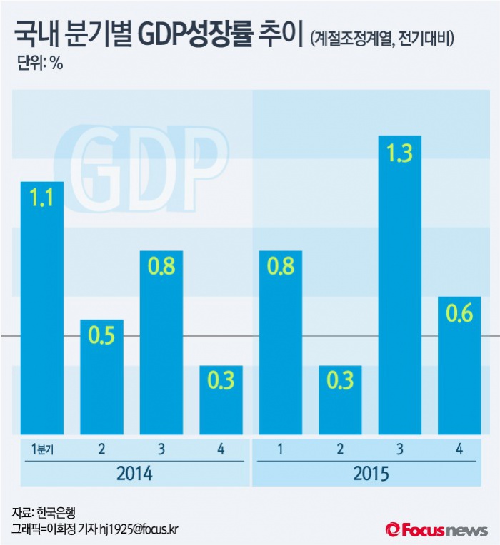 (서울=포커스뉴스) 한국은행이 26일 발표한 ‘2015년 4분기 및 연간 국내총생산’에 따르면 2015년 4분기 실질 국내총생산(GDP)은 전기 대비 0.6%로 그쳐 분기성장률은 3분기 이후 다시0%대로 내려앉았다.