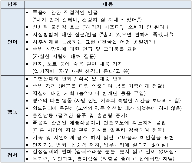 경고신호는 고인이 자살에 대해 생각하고 있거나 자살을 할 의도가 있음을 드러내는 징후를 의미하며 언어적, 행동적, 정서적 방식으로 표현될 수 있다.