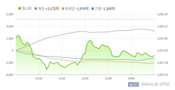 코스피는 전일 대비 0.61% 하락한 1881.87로 장을 시작했다. 이후 외국인과 기관의 팔자세에 낙폭이 확대됐다. 외국인은 이날까지 37거래일째 매도 행진을 이어갔다.