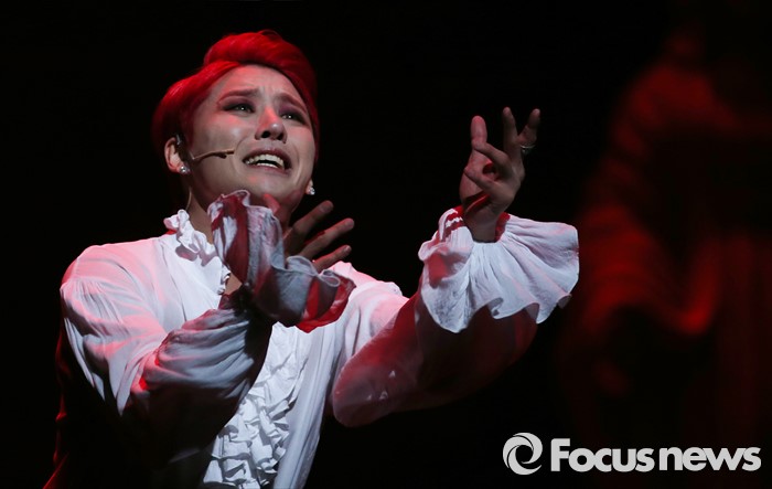 (서울=포커스뉴스) 26일 오후 서울 종로구 세종문화회관에서 열린 뮤지컬 '드라큘라' 프레스콜에 참석한 배우 김준수가 극중 드라큘라가 연인을 잃은 슬픔을 표현하고 있다.