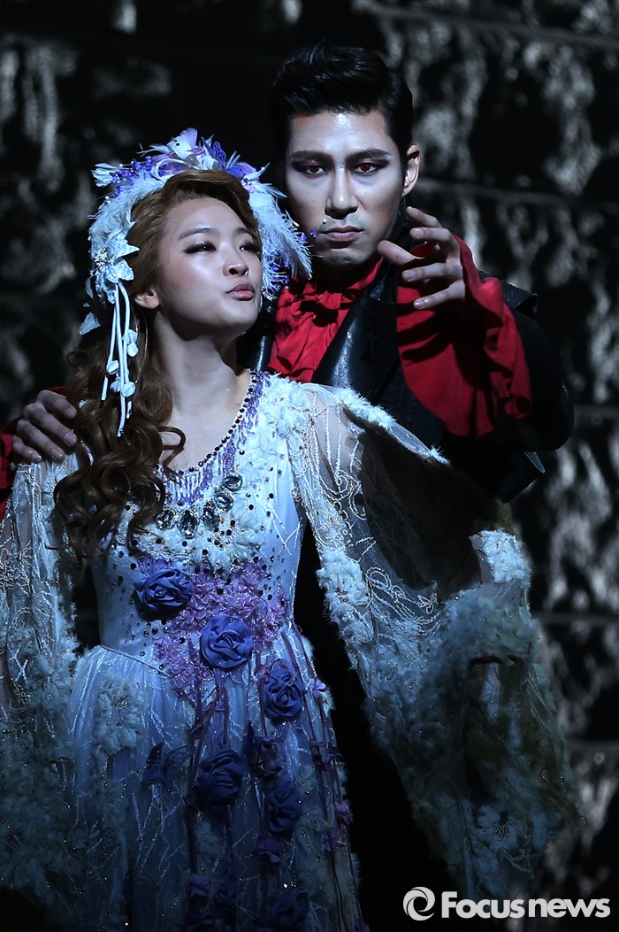(서울=포커스뉴스) 26일 오후 서울 종로구 세종문화회관에서 열린 뮤지컬 '드라큘라' 프레스콜에 참석한 배우 박은석과 이예은이 하이라이트 공연을 선보이고 있다.