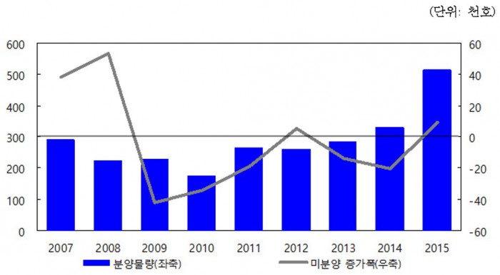 주택담보대출 관련, KDI는 "주택거래 호조, 집단대출 증가 등으로 은행권을 중심으로 증가폭이 확대되고 있으나, 가계부채 종합대책이 시행되는 2016년 이후에는 가계부채 증가세가 완화될 가능성이 있다"고 예상했다. 원리금 분할상환 및 소득증빙자료 제출 등을 요구하는 가계부채 종합대책이 시행되면서 가계부채 증가세가 완화될 것이란 설명이다.아파트 분양물량과 미분양증감 추이(전국기준), 2015년 미분양 증가폭은 11월까지 기준임 <자료출처=부동산114>